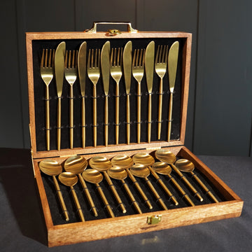 Much like people, even food has its right type. Our handcrafted ‘Aura Gold Cutlery Set of Four' has the perfect match for all of your servings. This set is made of stainless steel and consists of a Dining Spoon, Fork, Knife and one Teaspoon. The food-safe gold matte finish adds a festive gleam to your tables and even add elegance to your everyday dining. Pair it with other pieces from Aura Gold collection to complete the look.