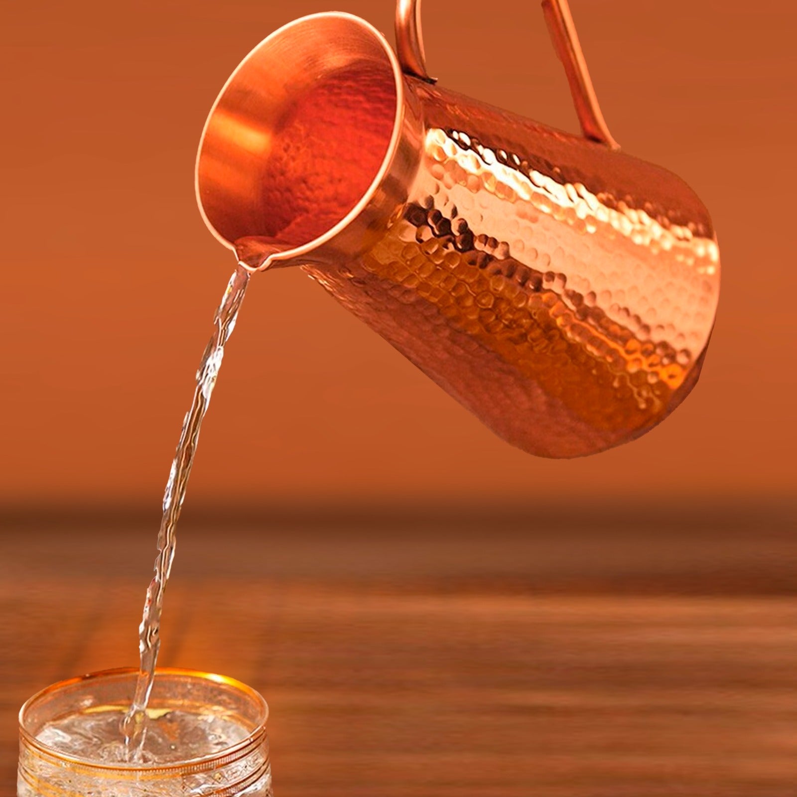 Introducing our Copper Pitcher, crafted from the finest quality copper. This exquisite piece of artistry showcases the perfect blend of traditional craftsmanship and modern Indian aesthetics. Handcrafted with care, it reflects the timeless beauty of Indian metalwork while adding elegance to your everyday dining.