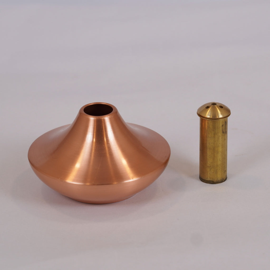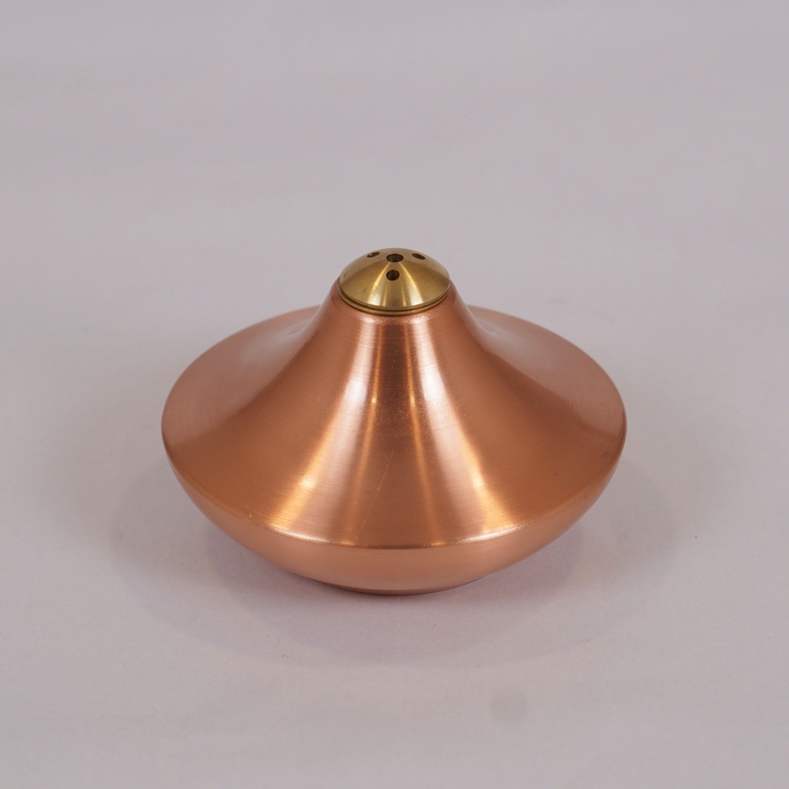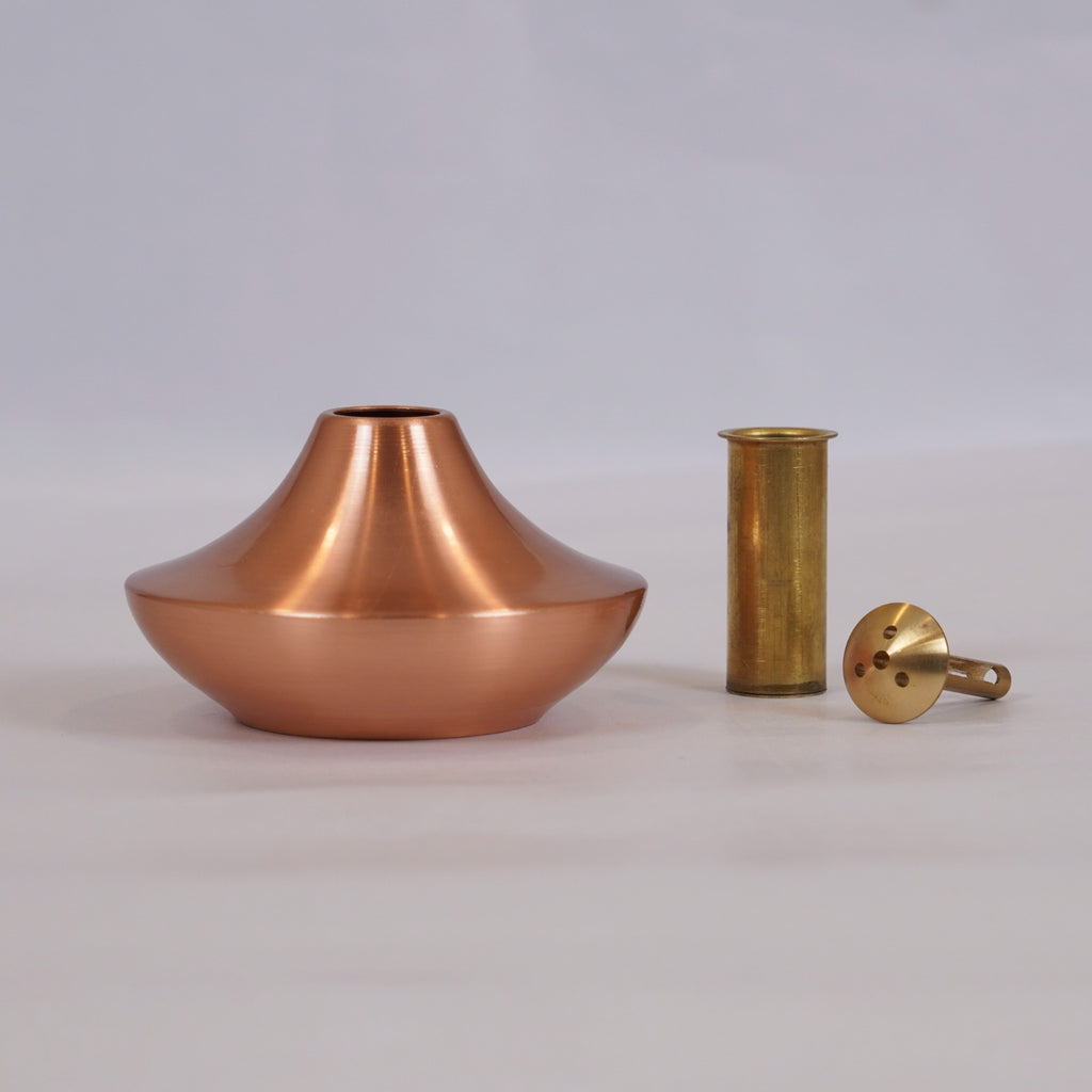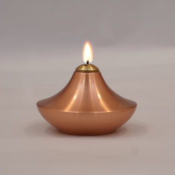 Move over candle lights, here comes the original the oil lamp in its sanchi avatar. Inspired by the hemispherical domes of the stupas of sanchi, this handspun oil lamp is meditative and aesthetic. The lamps is spun by hand out of copper and brass sheets. The fuel chamber can hold up to 25 ml of oil. Pour oil, insert wick and light the lamp and you're good to go for two to three hours.