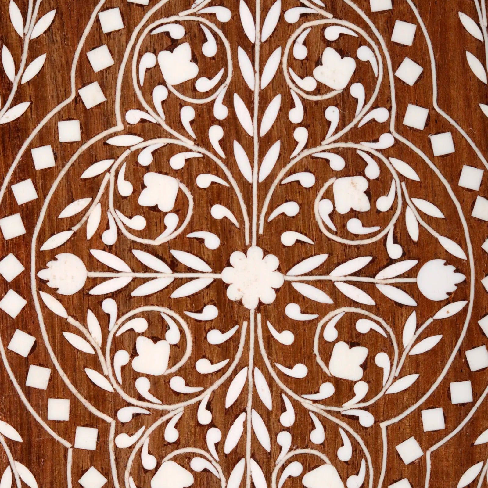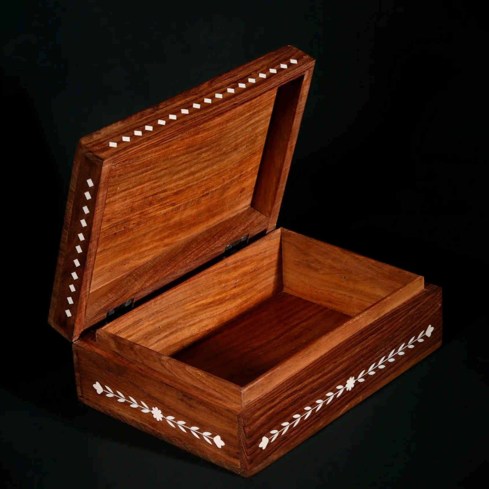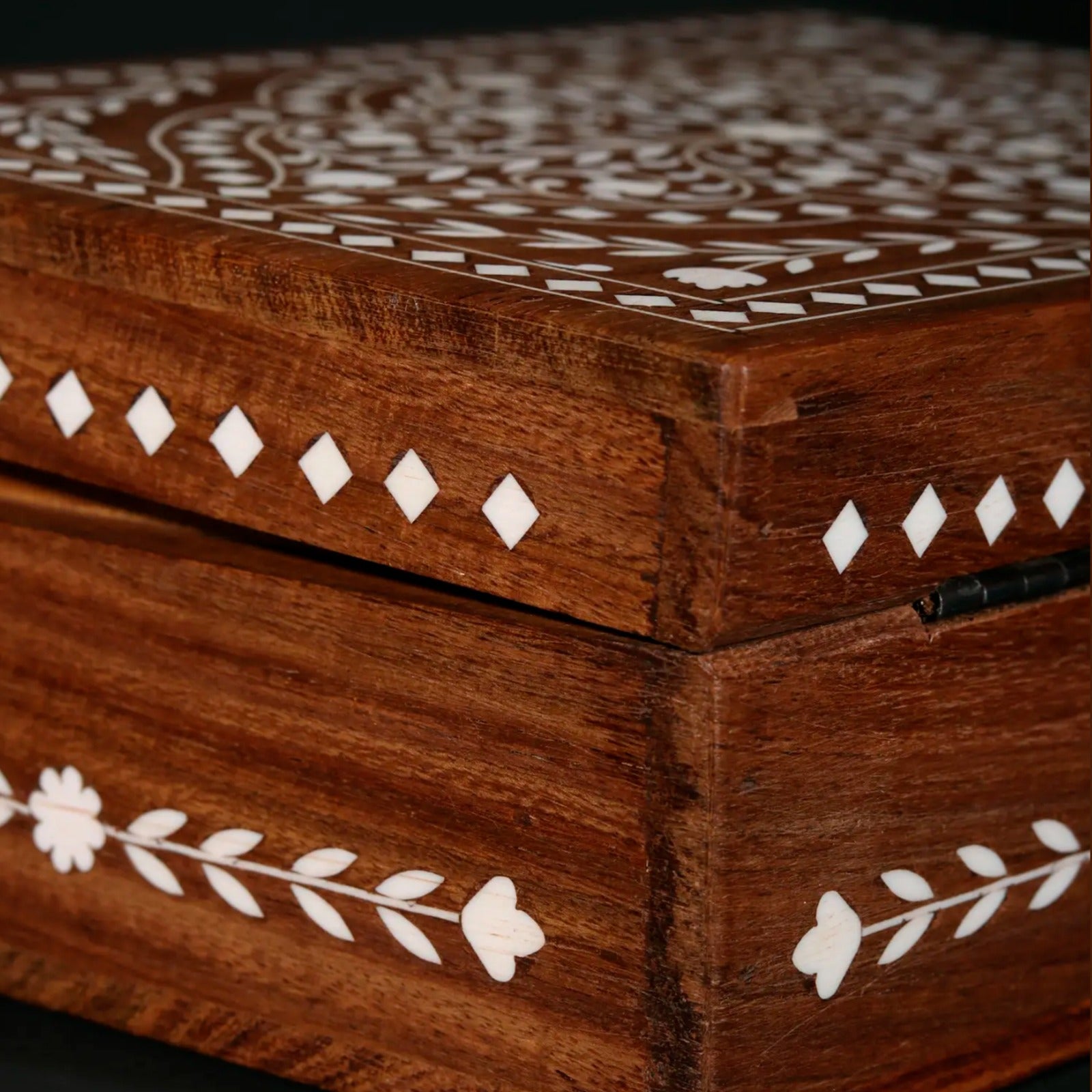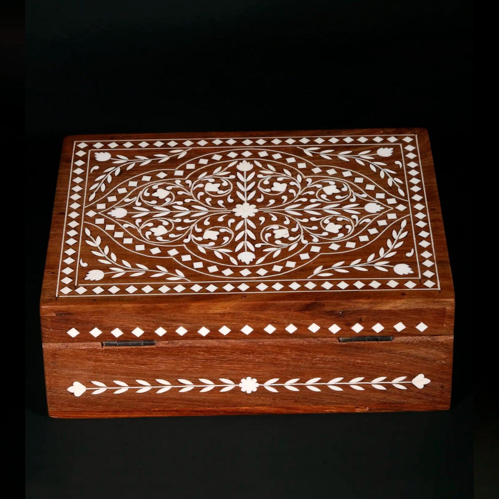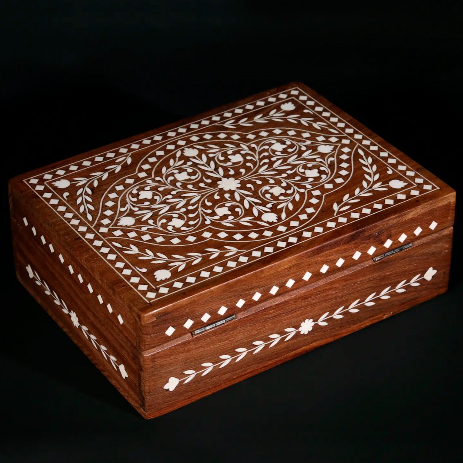 This exquisite 8" rectangular jewellery box is a testament to the artistry and craftsmanship of traditional Indian inlay work. Crafted from rich teakwood, the box showcases a stunning design of intricate floral patterns meticulously inlaid with bone. The warm tones of the teakwood are beautifully complemented by the creamy white of the bone inlay, creating a visually captivating piece that will add a touch of elegance to any dressing table or vanity. Its compact size makes it perfect for storing