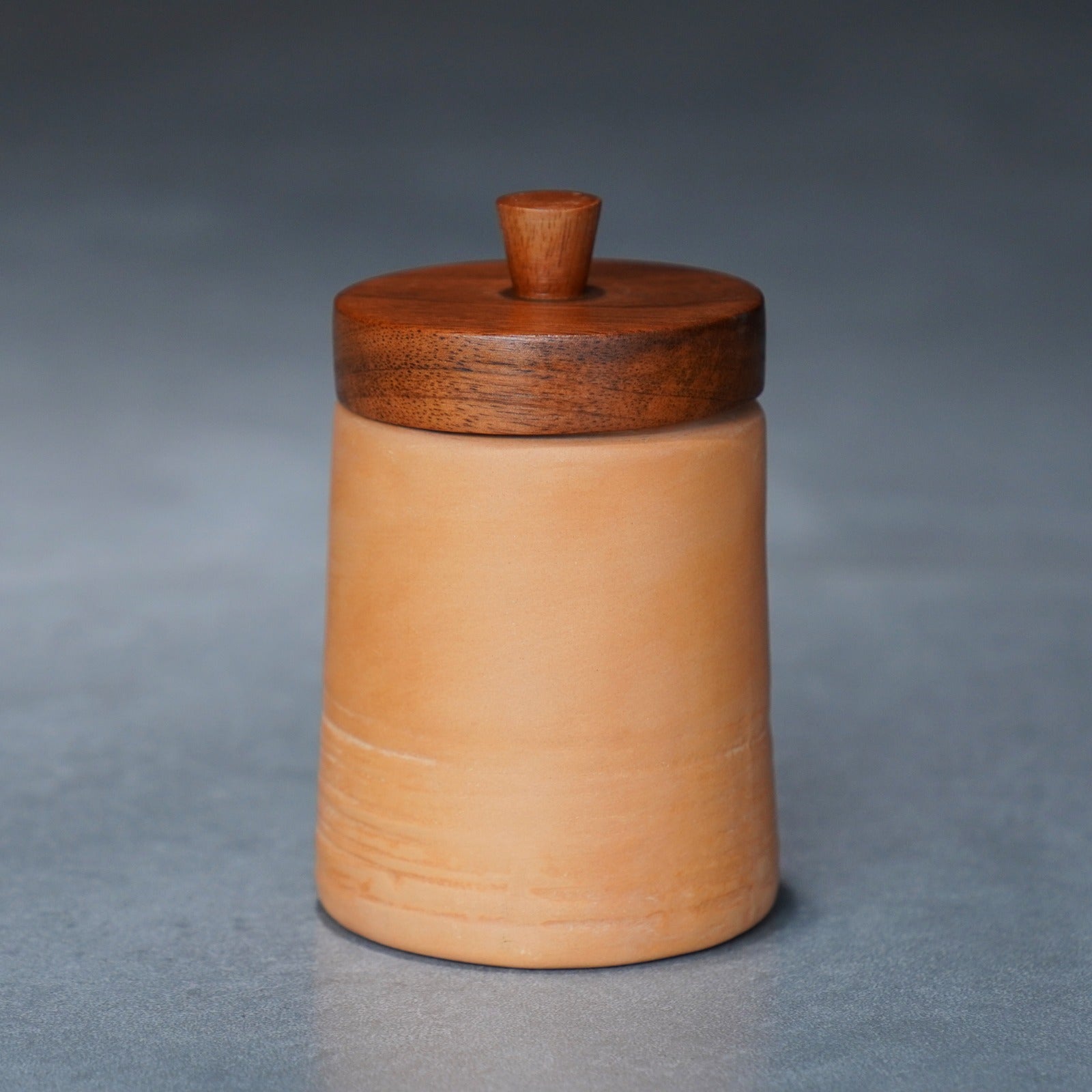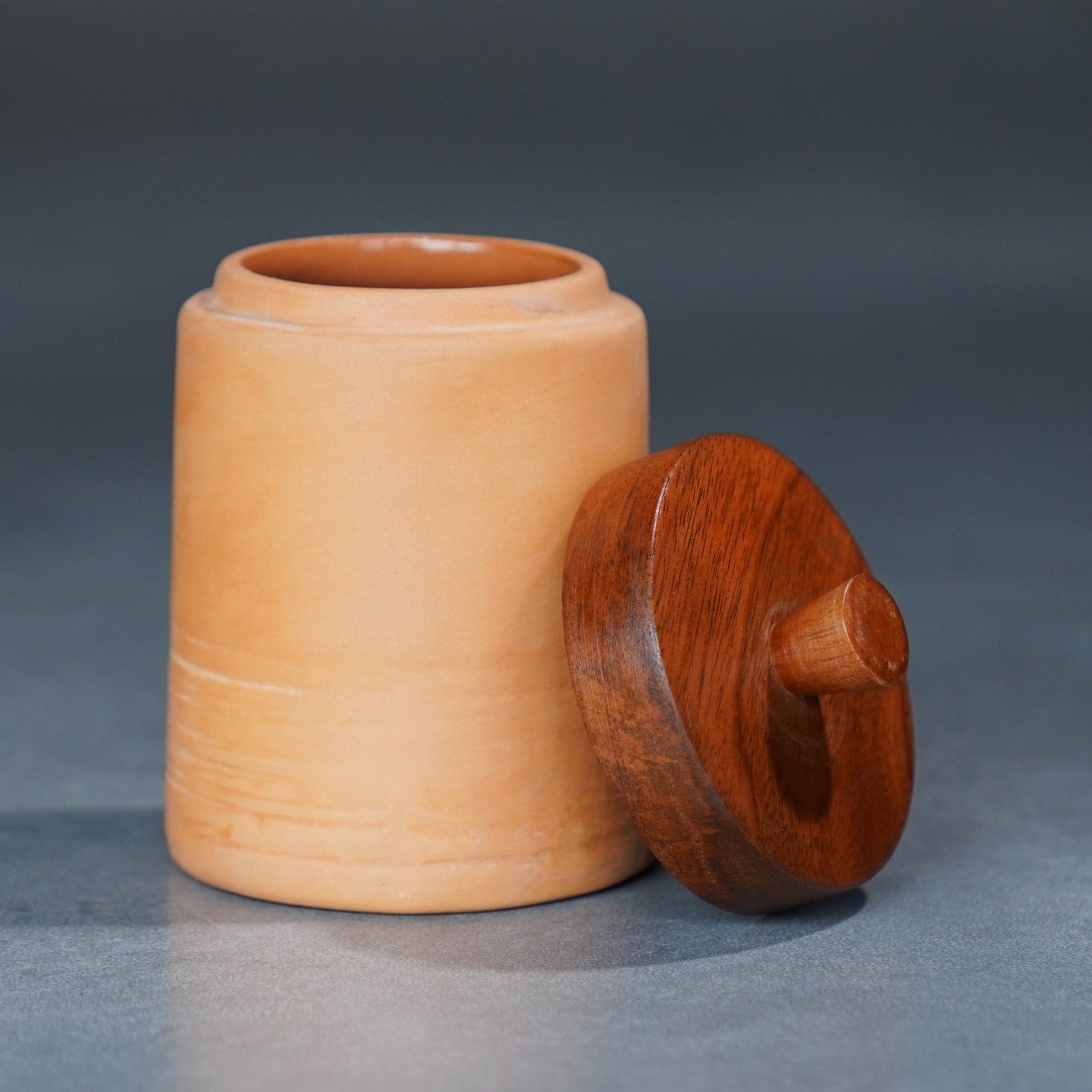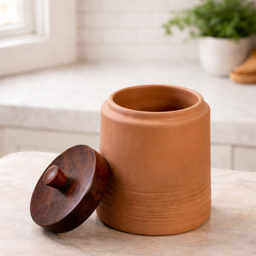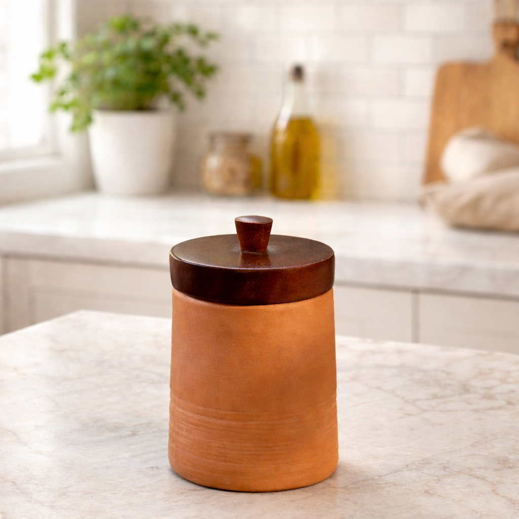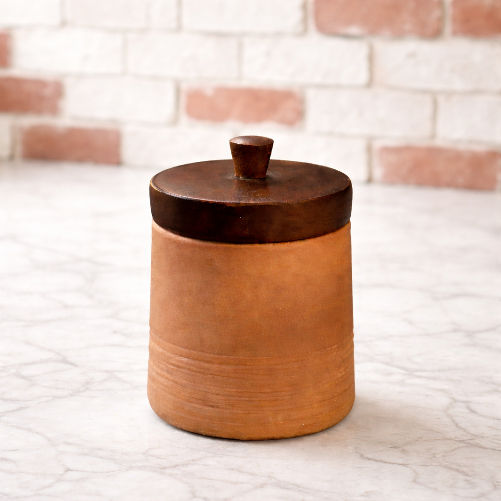 This terracotta jar, with its earthy hue, whispers stories of sun-baked landscapes and timeless traditions. Topped with a wooden lid, it brings a touch of modern elegance—creating a beautiful harmony between the past and the present.
